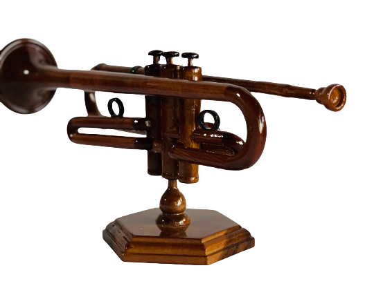 Treat the musician in your home with this handcrafted trumpet, modeled from mahogany with exceptional detail. Stand included. Size: 4.5" tall x 10" long.